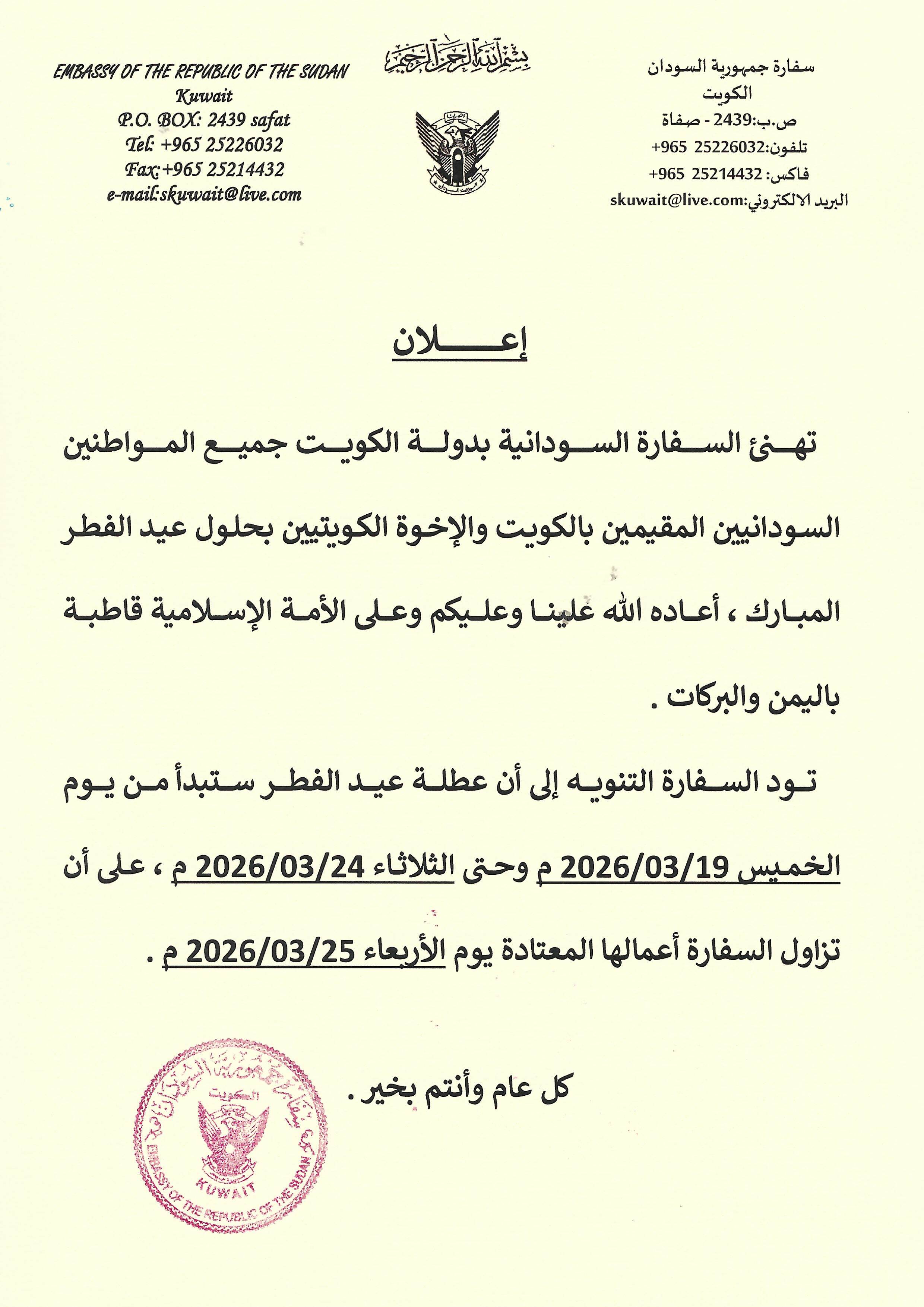 سفارة جمهورية السودان الكويت © جميع الحقوق محفوظة. sudan