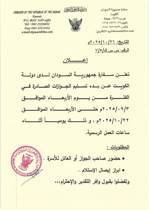 تعلن سفارة جمهورية السودان لدى دولة الكويت عن بدء تسليم الجوازات الصادرة في الفترة من يوم الأربعاء الموافق 3/09/2025م حتى الأربعاء الموافق 22/10/2025م ، و ذلك يومياً أثناء ساعات العمل الرسمية.